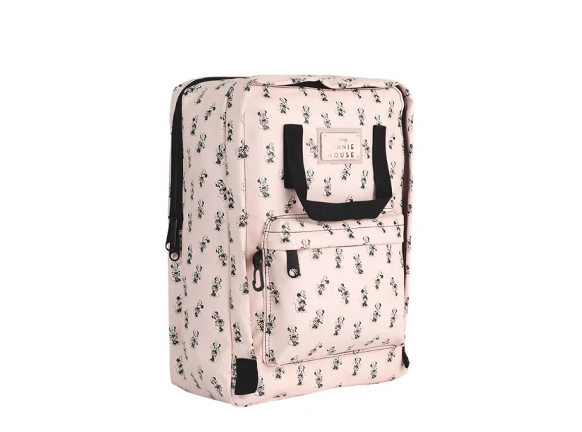 Fabricada en PU impreso con acabado engomado de alta calidad Estampado integral con ilustraciones de Minnie en tono rosa pastel Logo metálico en placa frontal Correas frontales reforzadas para uso tipo bolso Dos compartimentos con cierre para mejor organización Espalda acolchonada para mayor comodidad Base reforzada y detalles en negro Capacidad: 18 litros Apta para notebook de hasta 17 pulgadas Medidas: 40 x 28 x 16 cm