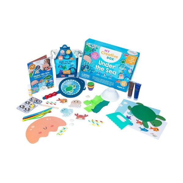 Incluye: Kit de arte del proceso oceánico Kit de actividades para enhebrar medusas Kit de arte para combinar formas y colores de peces Kit de manualidades de tortuga y nido Kit sensorial de juego acuático con tiburones Rompecabezas Bajo el mar Kit de pinceles y pegamento Juego de pinturas Contenido creativo y libro de instrucciones